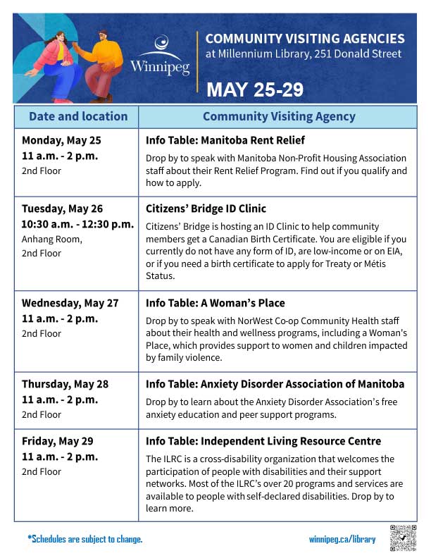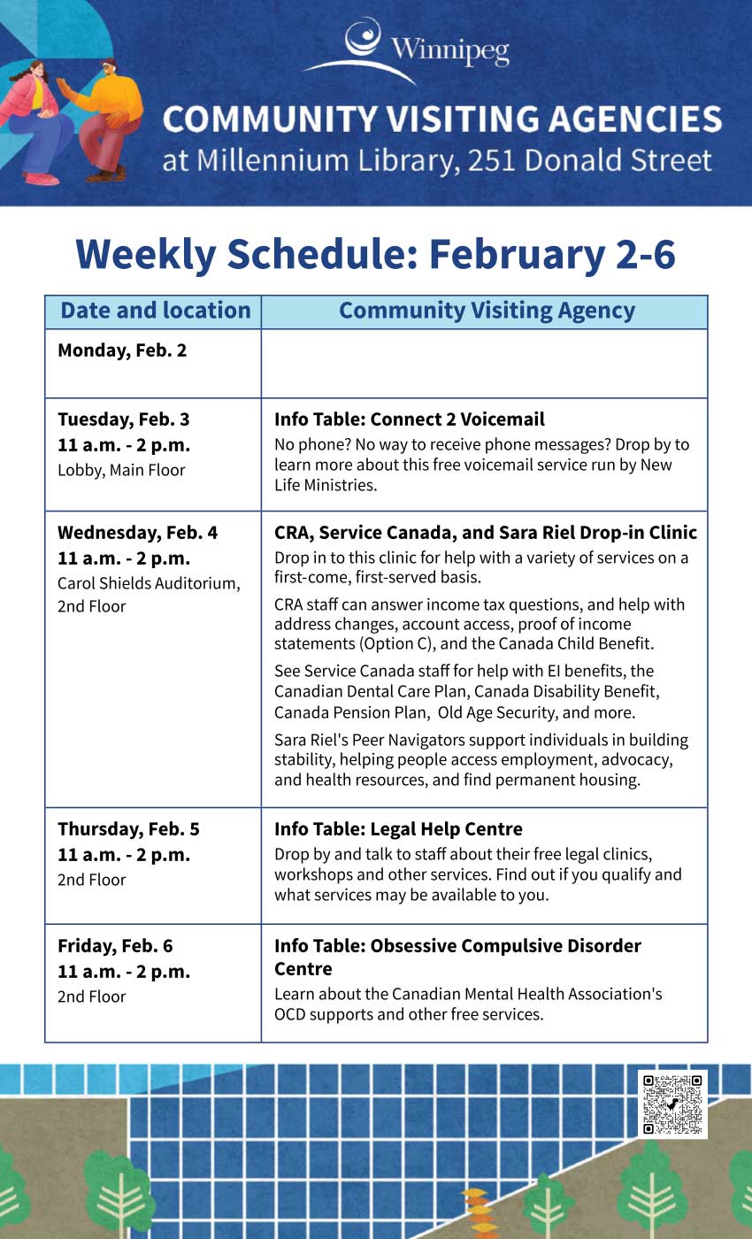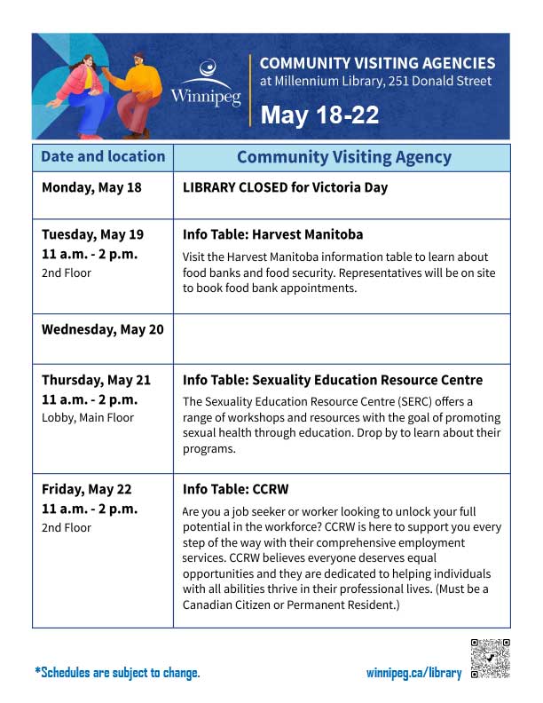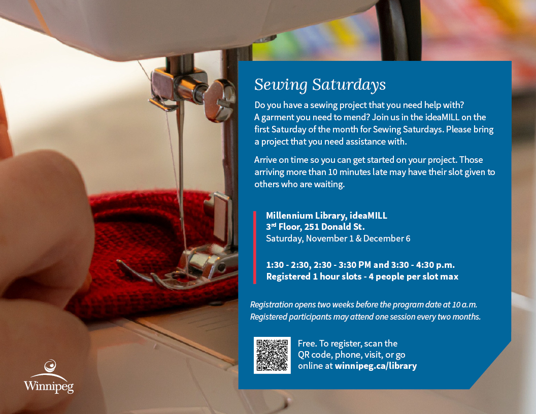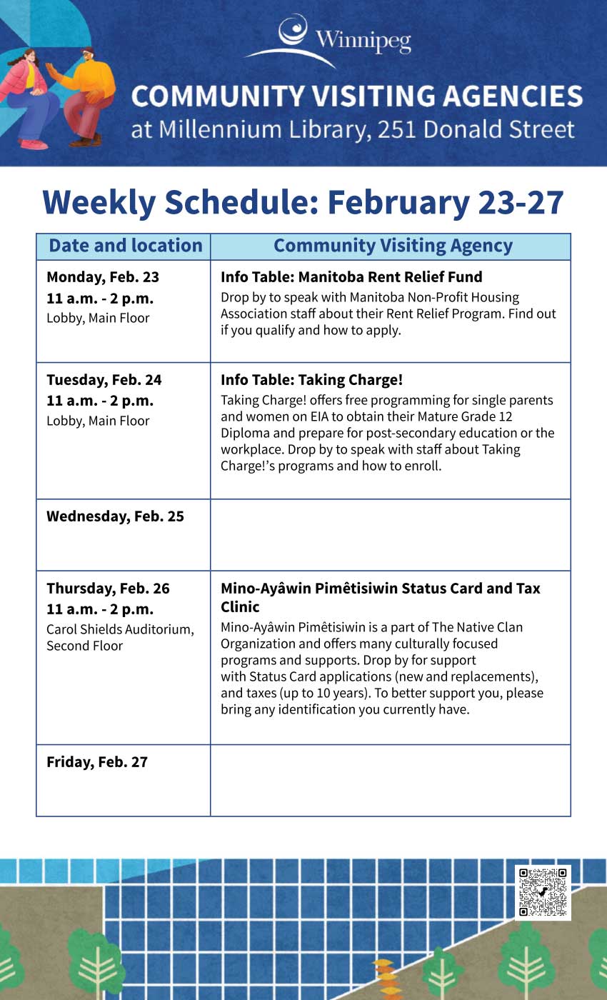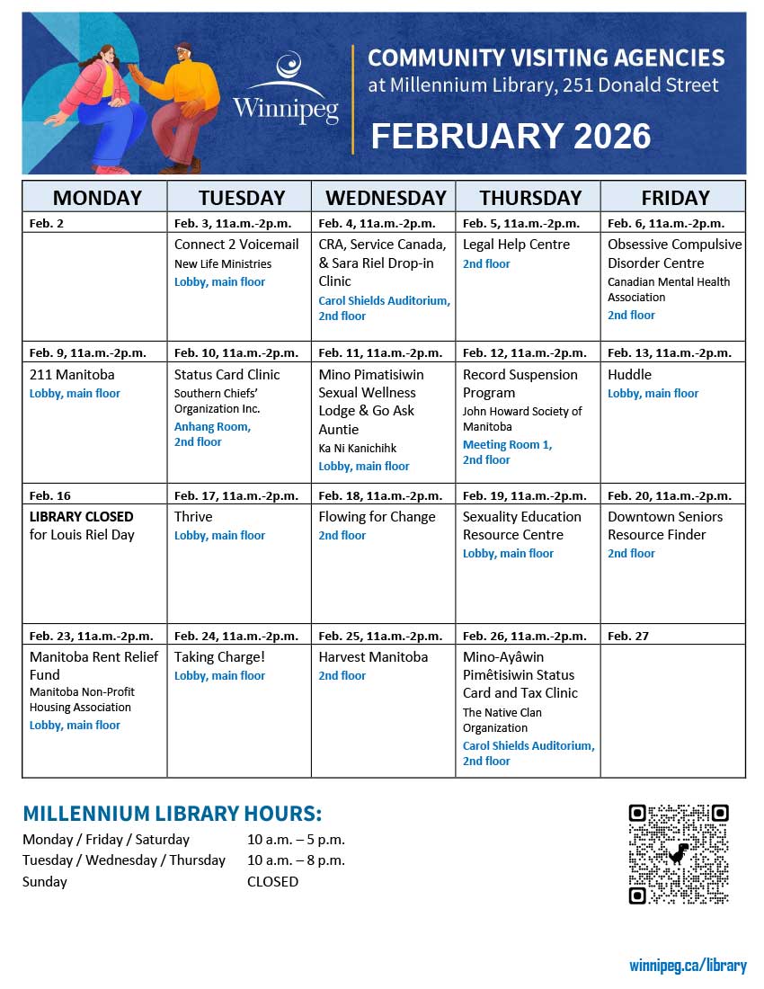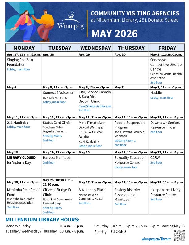 The library offers an adult literacy program, a Writer-in-Residence program, a Maker-in-Residence program, and online and in-person programs. All Winnipeg Public Library programs are free of charge. Some programs require registration. Go to our Calendar of Events for library programs at-a-glance and to register for a program online, by phone or in person.