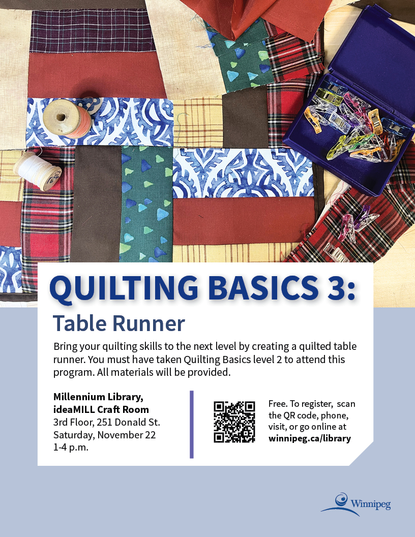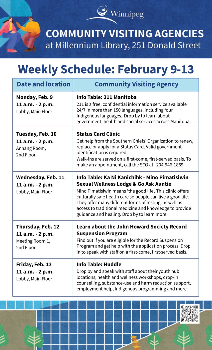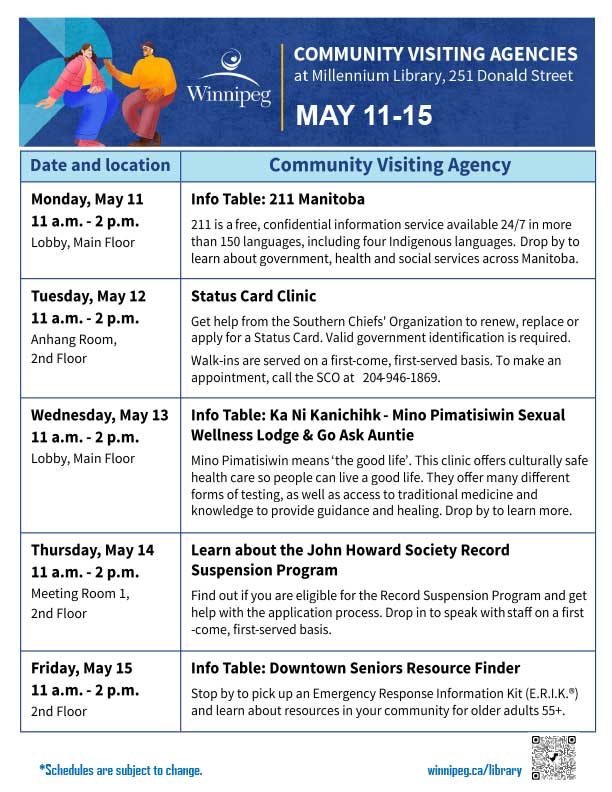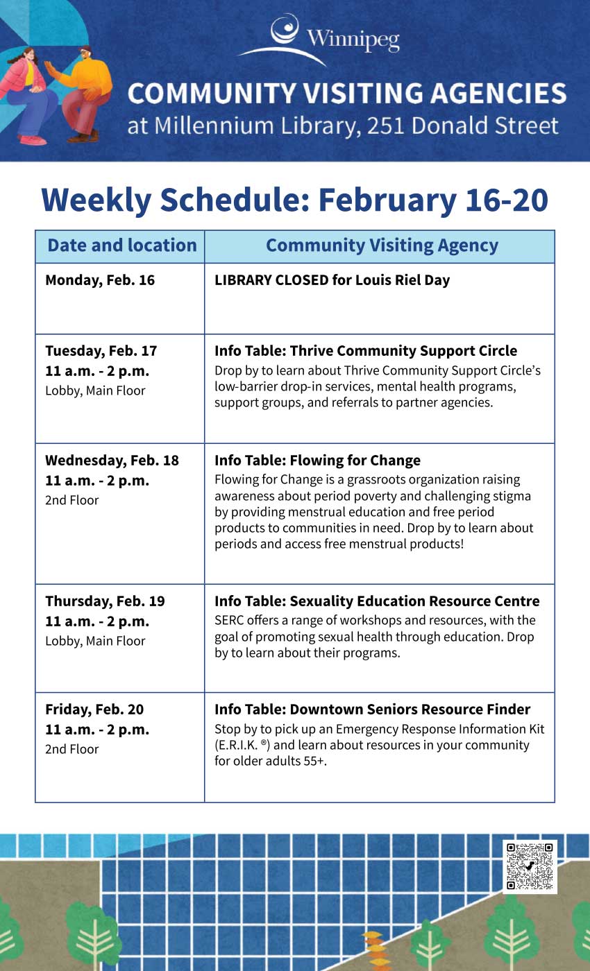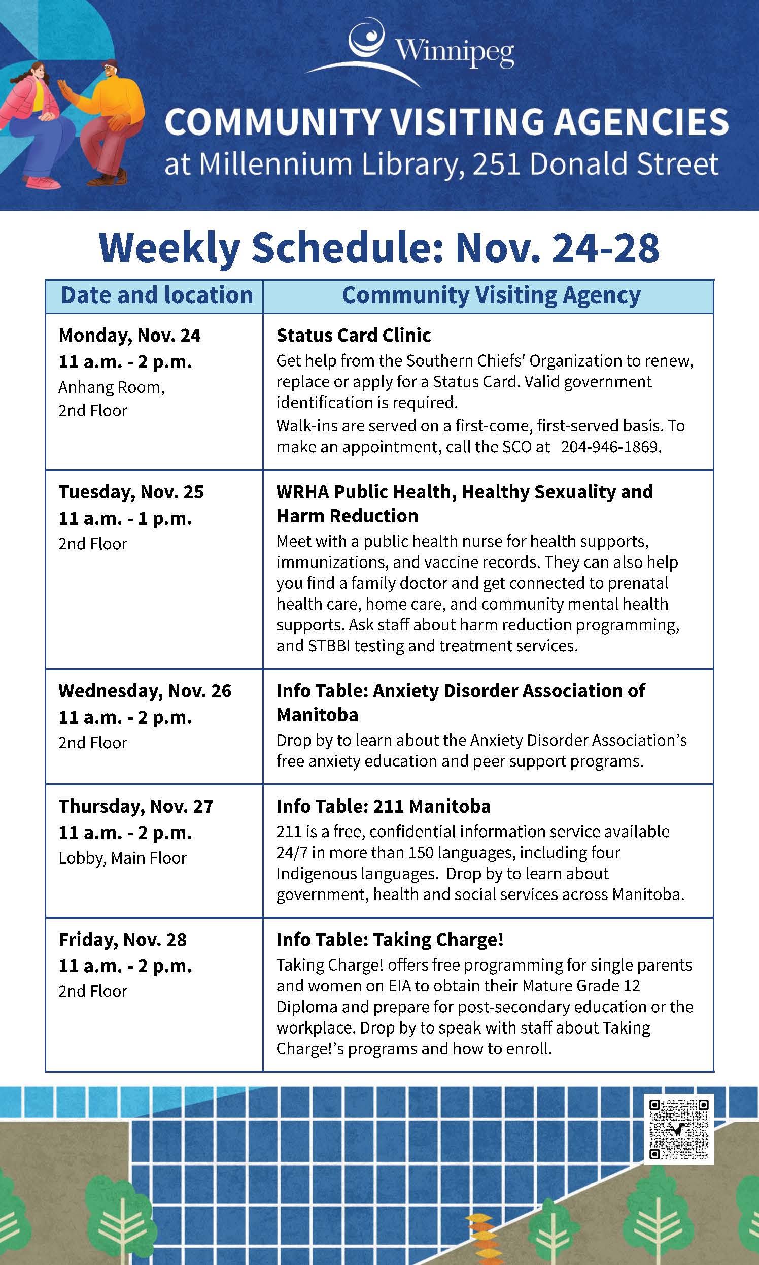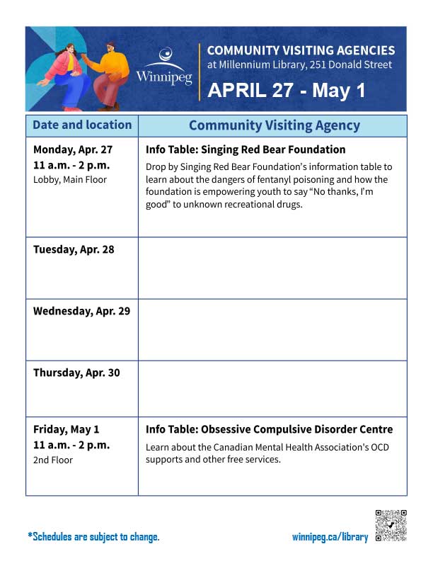 The library offers an adult literacy program, a Writer-in-Residence program, a Maker-in-Residence program, and online and in-person programs. All Winnipeg Public Library programs are free of charge. Some programs require registration. Go to our Calendar of Events for library programs at-a-glance and to register for a program online, by phone or in person.