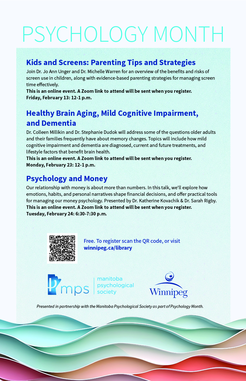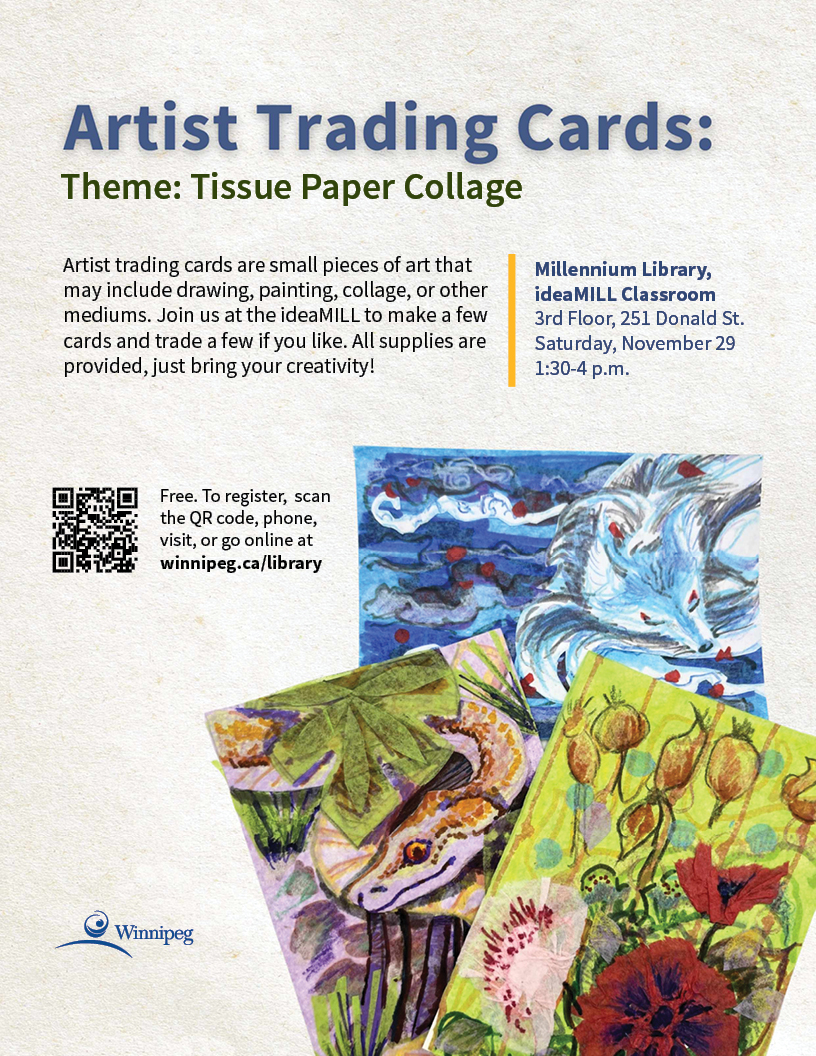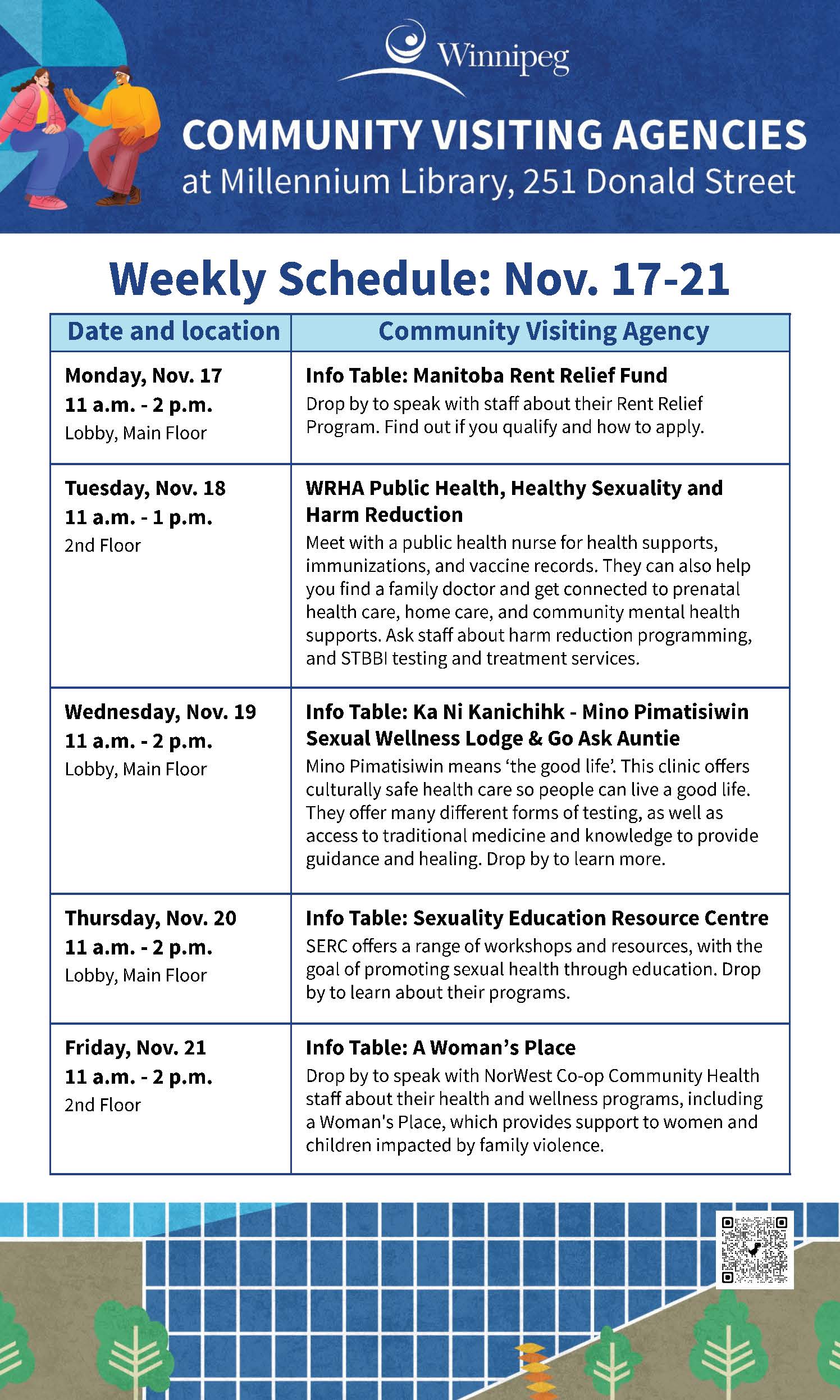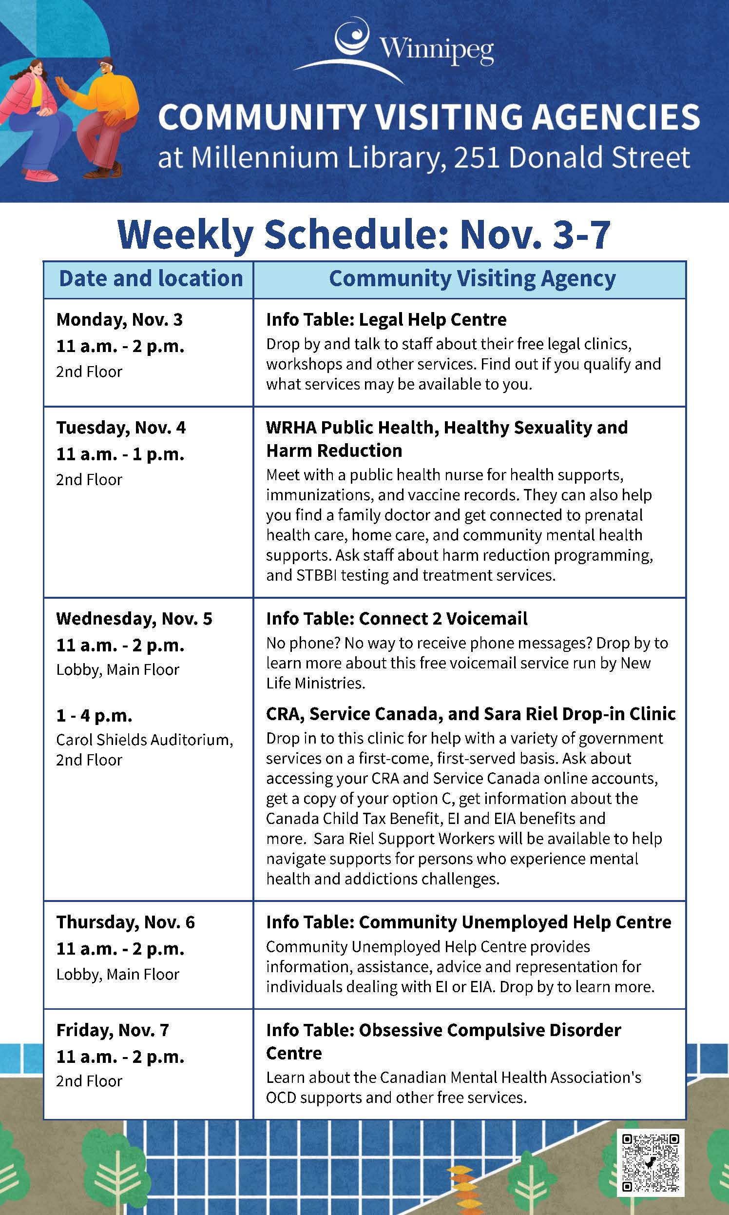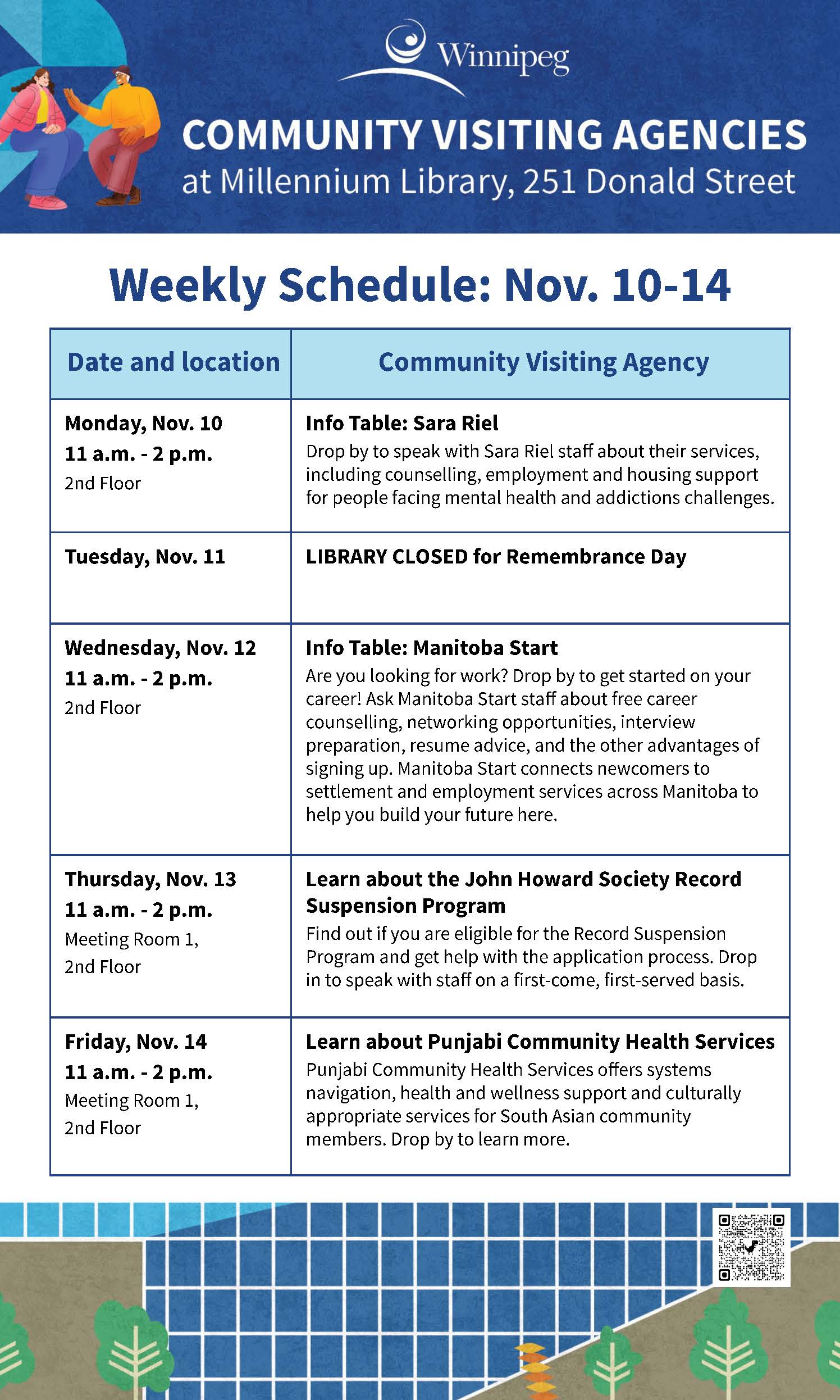 The library offers an adult literacy program, a Writer-in-Residence program, a Maker-in-Residence program, and online and in-person programs. All Winnipeg Public Library programs are free of charge. Some programs require registration. Go to our Calendar of Events for library programs at-a-glance and to register for a program online, by phone or in person.
