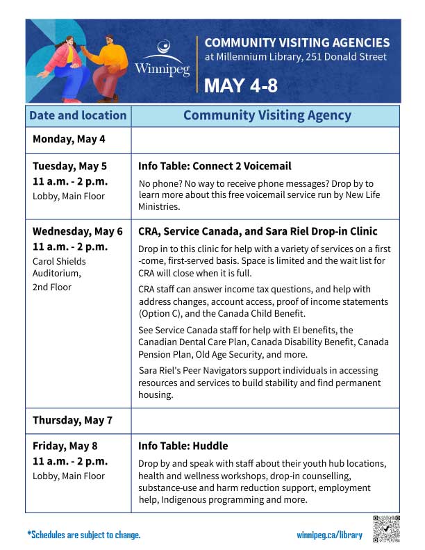 - Canada Revenue Agency (CRA), Service Canada, and Sara Riel Drop-in Clinic (May 6, June 3)