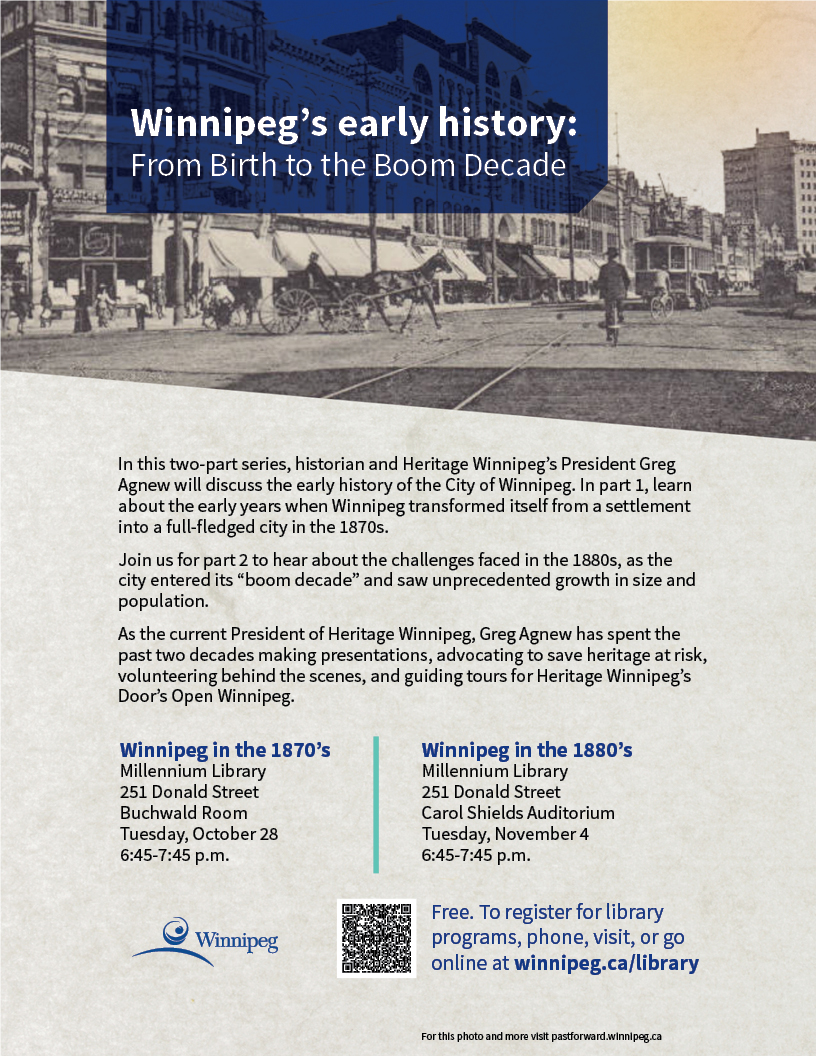 - Winnipeg’s early history: From Birth to the Boom Decade (October 28; November 4)